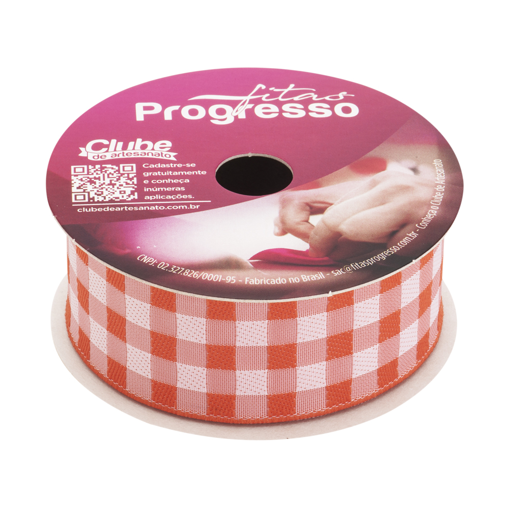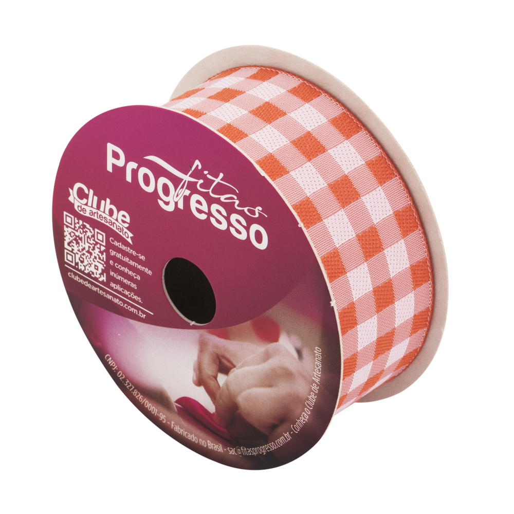 Tags: Fitas Progresso, fita decorativa, xadrez bordado, laranja, largura de 29mm, rolo de 10 metros, artesanato, decoração, festas.
